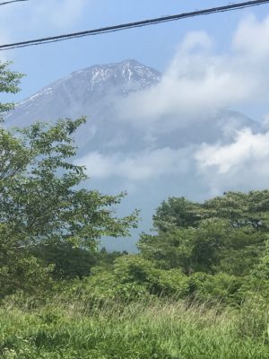 ふもとっぱらキャンプ場 雲で富士山見えない そろそろ炭もできたので アスパラと豚肉 帆立 グラスに 車でテレビを見て雨上がりを待つ