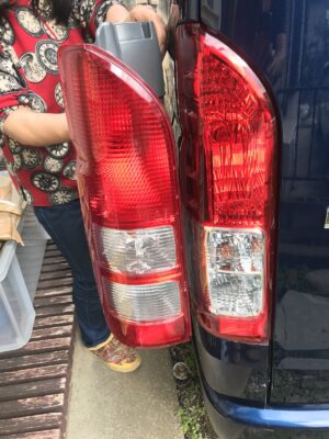 ハイエースのテールの入れ替えは、とても簡単で、ネジを2本外すだけ。あとはグイッと外せば簡単に外せるので反対にコンコンと叩いて入れてネジ閉めるだけ。